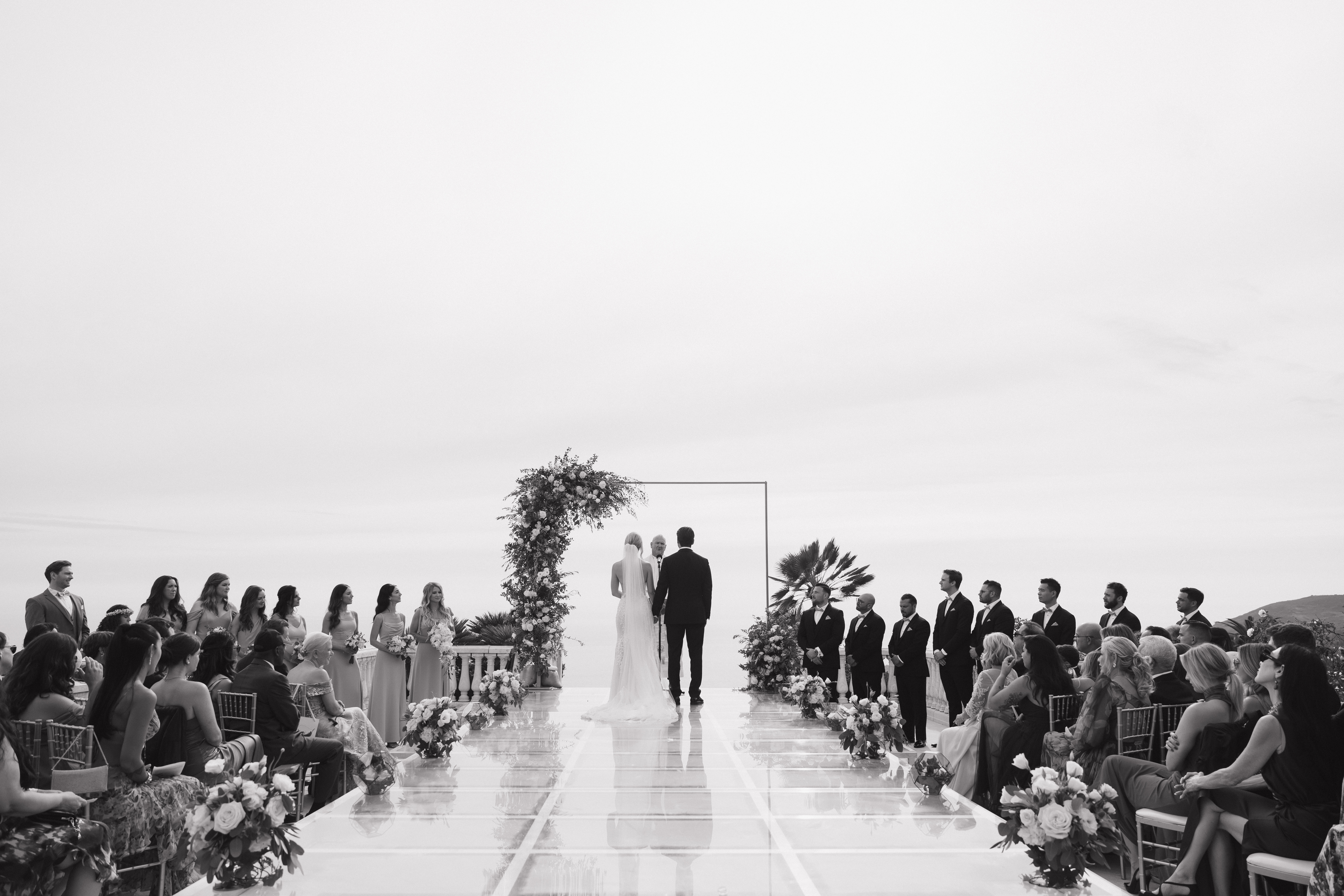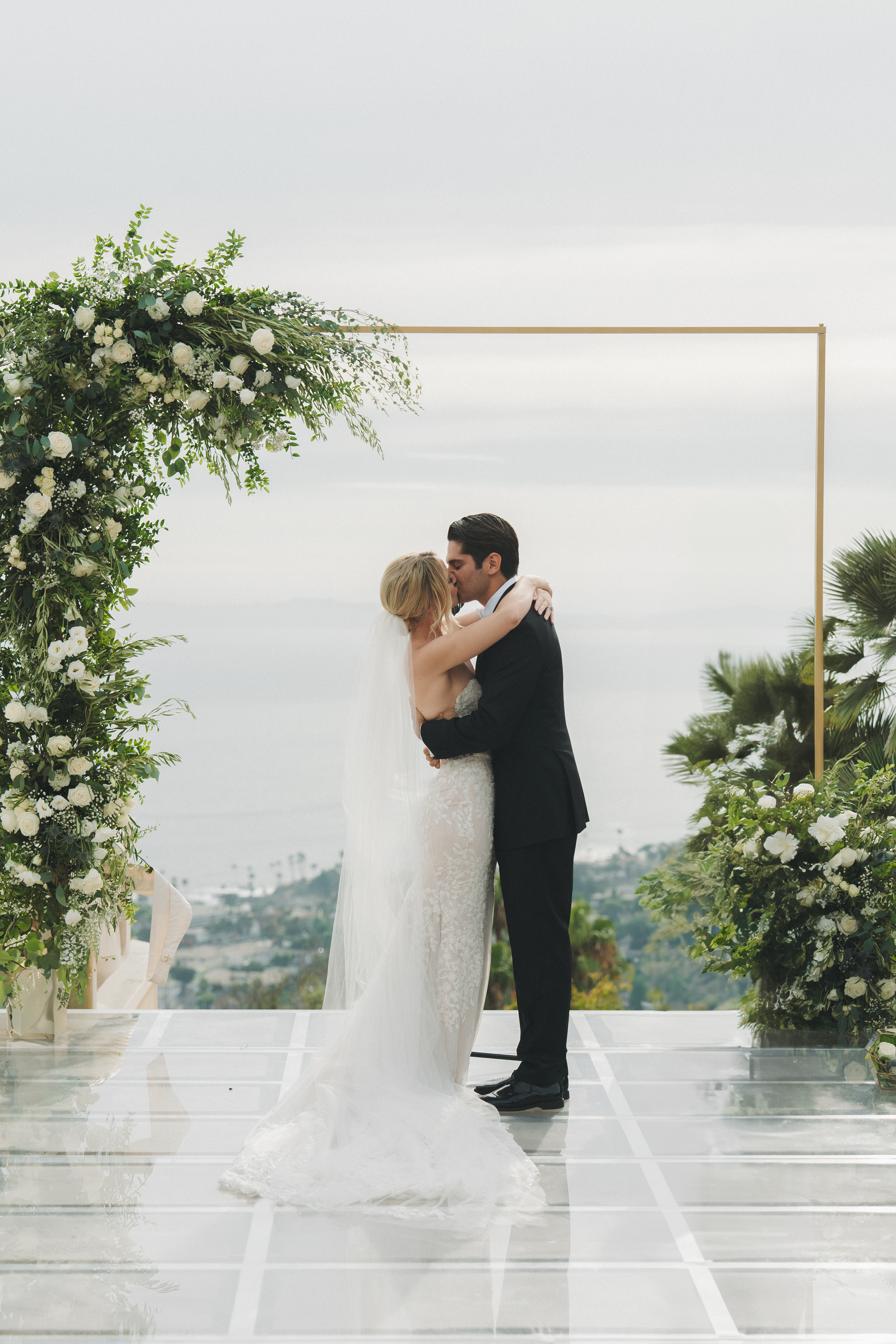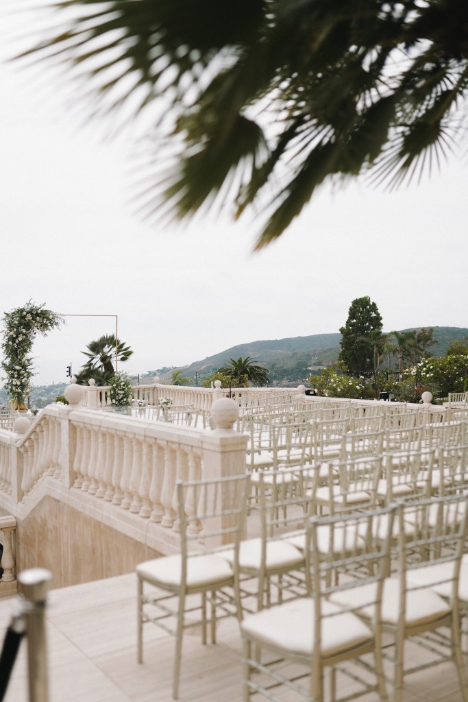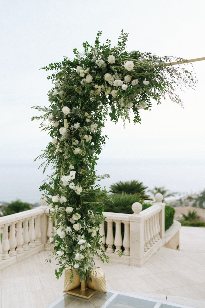 We wanted a minimalist ceremony that elevated the surrounding marble areas. This was mostly to make the space feel like we were on a cloud (especially with THAT VIEW!), but also served as a great way to save money. We used champagne chiavari chairs, though we were also presented with the option of the very trendy clear plastic chairs. Honestly the clear chairs simply felt too modern, we believed in honoring the tone of the space. For florals, we had very simple aisle bouquets placed, which we then repurposed during our reception. Our floral arch combined modern and rustic with overgrown greenery and pops of white roses. We opted for a rectangular floral arch to create the illusion of being “framed.” A picture perfect moment, on a budget.