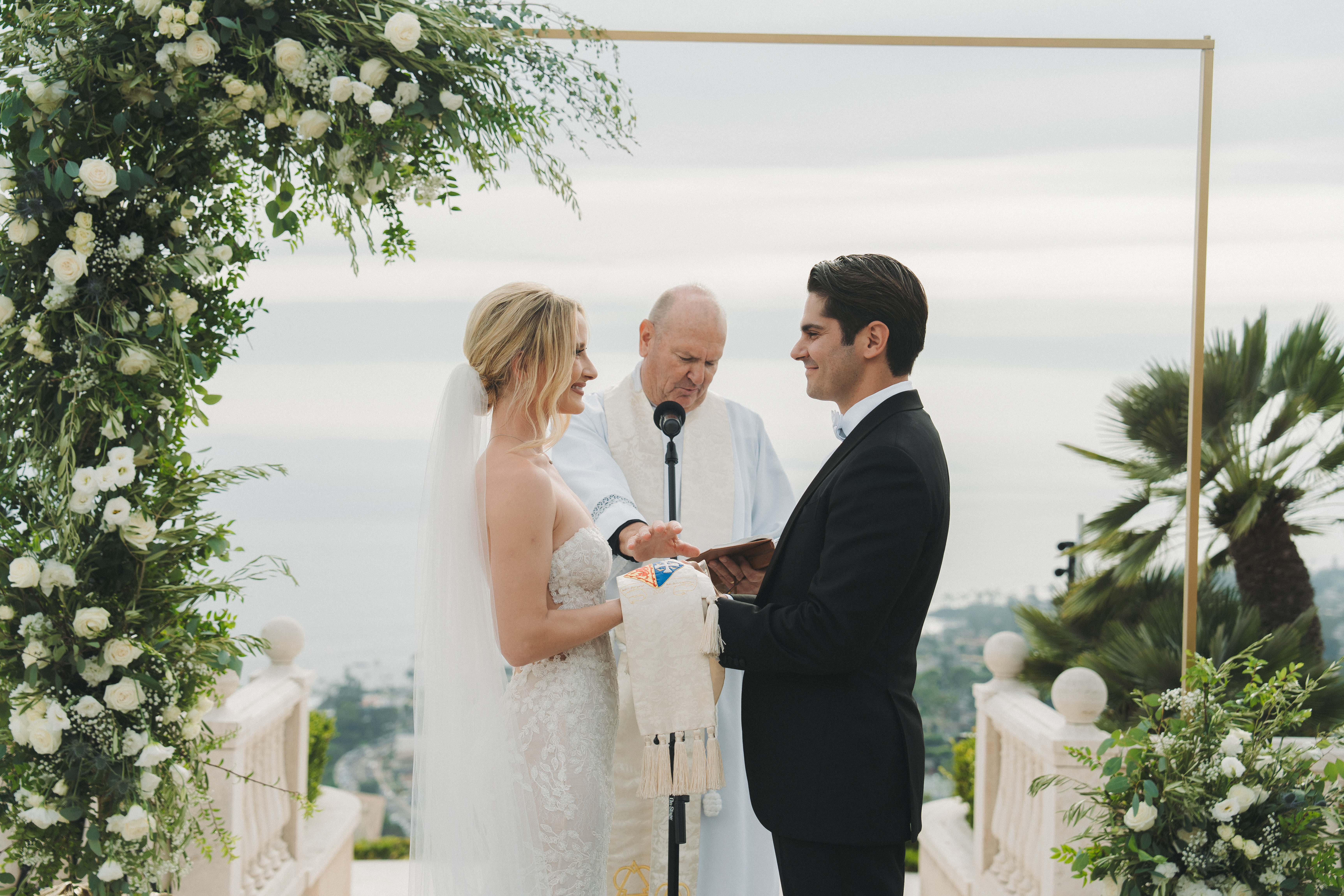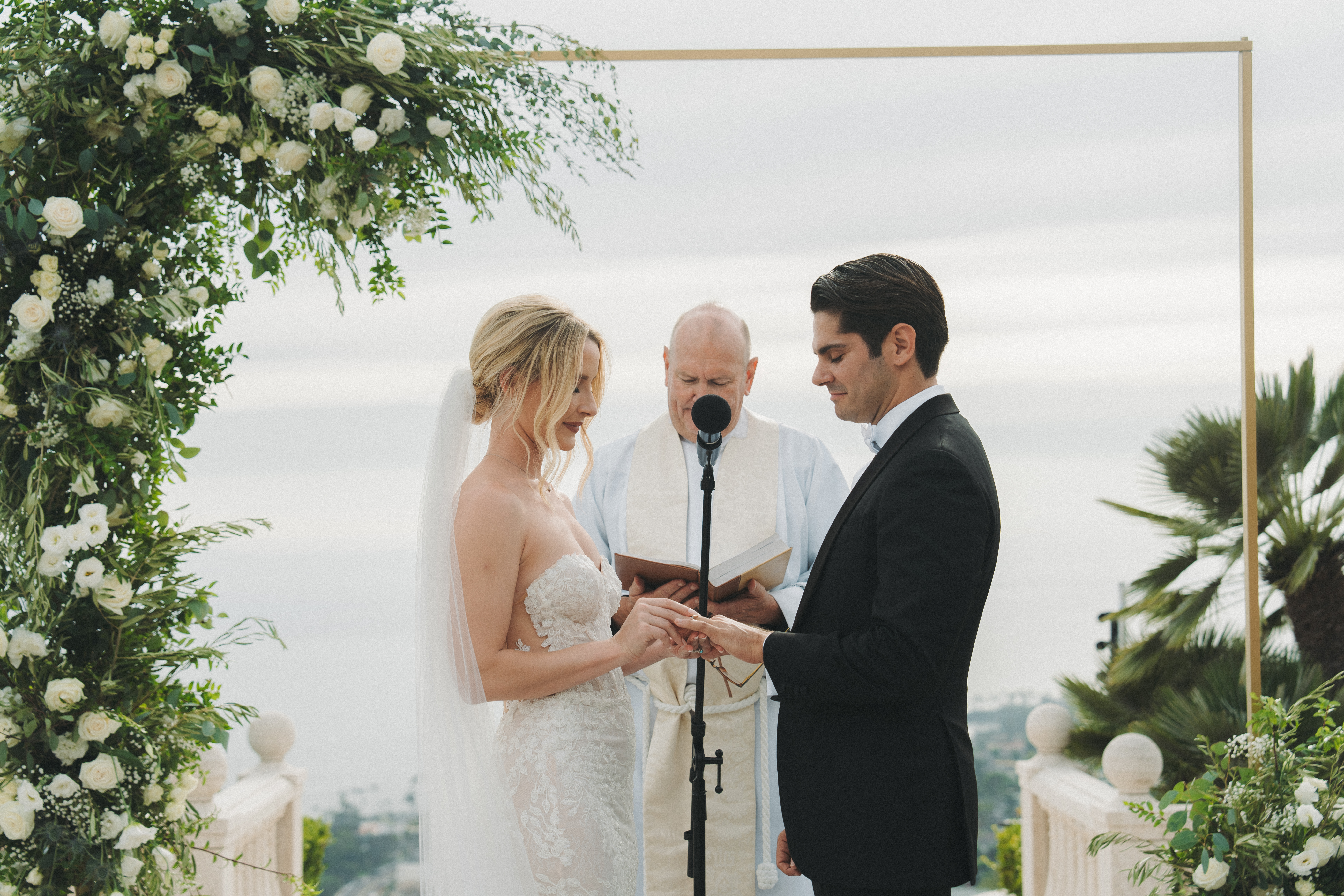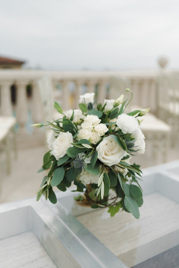 We wanted a minimalist ceremony that elevated the surrounding marble areas. This was mostly to make the space feel like we were on a cloud (especially with THAT VIEW!), but also served as a great way to save money. We used champagne chiavari chairs, though we were also presented with the option of the very trendy clear plastic chairs. Honestly the clear chairs simply felt too modern, we believed in honoring the tone of the space. For florals, we had very simple aisle bouquets placed, which we then repurposed during our reception. Our floral arch combined modern and rustic with overgrown greenery and pops of white roses. We opted for a rectangular floral arch to create the illusion of being “framed.” A picture perfect moment, on a budget.